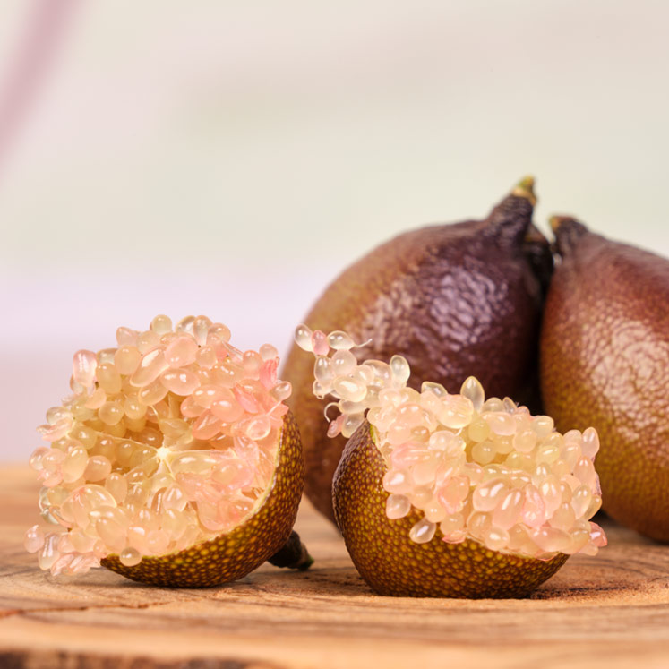 Die Kaviar Limette - gerne auch veganer Kaviar - genannt, ist eine extravagante Zitrusfrucht, die den Geschmack unterschiedlicher Zitrusarten vereint. Der Geschmack variiert zwischen der überwiegenden Limette, frischer Zitrone und einem Hauch von Grapefruit. Die Frucht lässt sich einfach in der Mitte mit dem Fingernagel teilen, anschließend lassen sich die Kaviarkugeln, gefüllt mit Fruchtfleisch und Saft, leicht aus der Hülle drücken. Die Konsistenz ist schön fest, die Fruchtperlen sind knackig beim Zerbeißen.